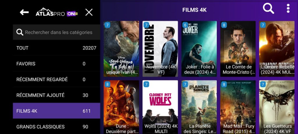Atlas Pro intègre une section films organisée, facilitant la navigation et la découverte grâce à une présentation claire et une lecture fluide sur tous les appareils.