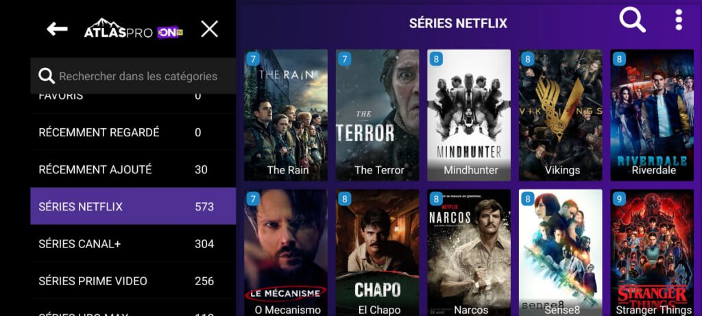 La section séries d’Atlas Pro permet de suivre facilement les contenus épisodiques grâce à une interface intuitive et une organisation pensée pour le confort de l’utilisateur.